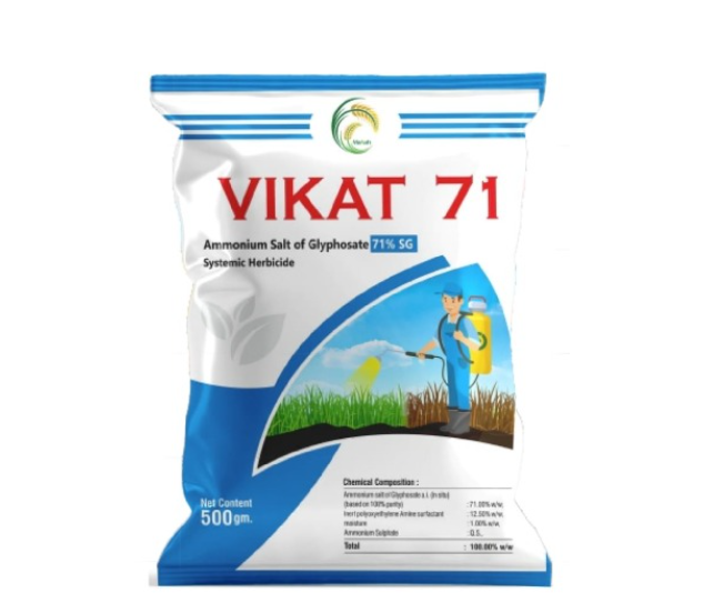 Features & Uses: VIKAT 71 used for post emergence herbicide for the control of annual perennial, broad leaf and grassy weeds. When applied to foliage reaches theroots and rhizomes of the plant by the process of translocation, there by destroying the weeds from below the round.